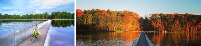 La piste cyclable de Bokrijk vous permet de traverser l’eau : spectacle magique assuré ! Traversez l’un des étangs de De Wijers d’une rive à l’autre. Au milieu, l’eau est au niveau de vos yeux. Cette expérience cycliste est également accessible près d’un point-nœud (91). Préparez-vous pour une balade unique ! Si vous partez à vélo de Hasselt (à partir du point-nœud 96), vous passerez en bordure du canal Albert, traverserez De Wijers et longerez des pièces d’eau rafraîchissantes pendant 22 km.