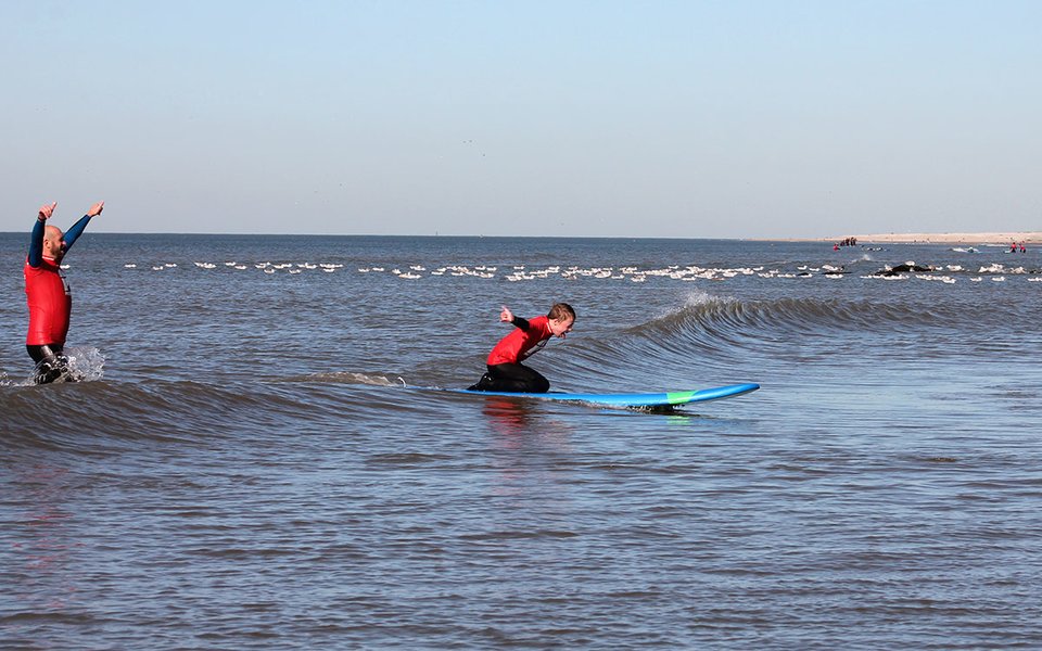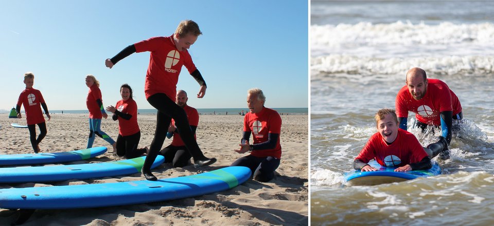 Si la première leçon est encore difficile, c'est au cours de la troisième que Tijs découvre le plaisir de surfer. Allongé sur sa planche, il prend une vague. Marjan : « On a alors vu un sentiment de victoire sur son visage. « Je peux le faire ! »